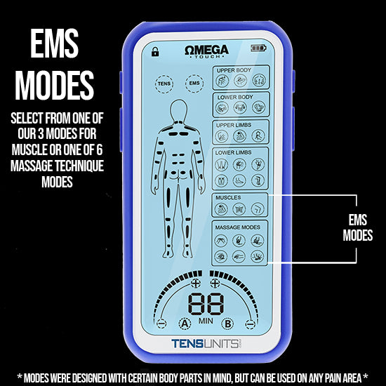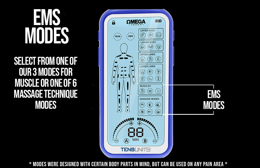The Omega Touch Pro combines the latest TENS (Transcutaneous Electrical Nerve Stimulation) and EMS (Electrical Muscle Stimulation) in a single massager designed to non-invasively reduce and relieve the pain related to a variety of short-term injuries and chronic pain conditions. The Omega's waveform technology can help block the body’s pain signals and release endorphins ( the body's natural pain reliever ).