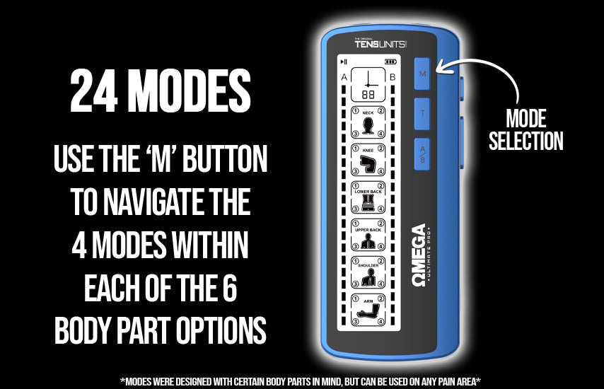 The Omega Ultimate Pro combines the latest TENS (Transcutaneous Electrical Nerve Stimulation) and EMS (Electrical Muscle Stimulation) in a single massager designed to non-invasively reduce and relieve the pain related to a variety of short-term injuries and chronic pain conditions. The Omega's waveform technology can help block the body’s pain signals and release endorphins ( the body's natural pain reliever ) that improve circulation and alleviate the pain associated with conditions ranging from Sciatica and Tendonitis to Plantar Fasciitis and Fibromyalgia.